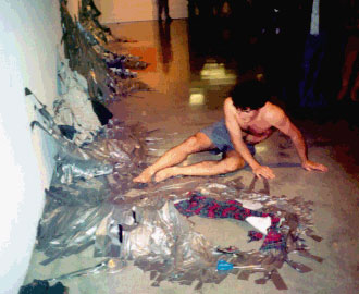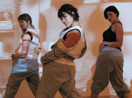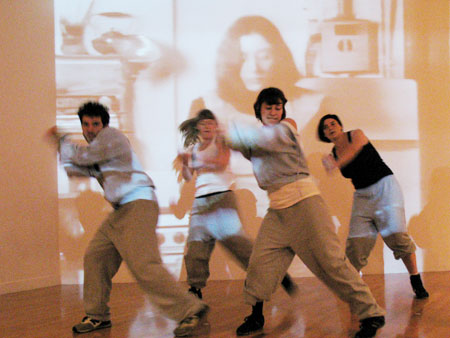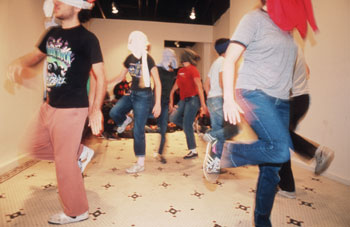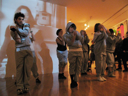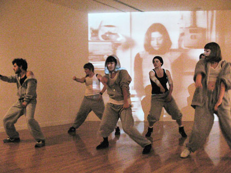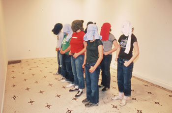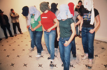 This performance began with the 8 members of Norma assembled in rows of 4 in the centre of the gallery. Their heads were covered (and their vision obscured) by items of their own clothing. Unaccompanied by music, the group performed a series of line dances; to keep in time, members counted aloud to themselves and each other in 4-beat measures. As each dance progressed, the line formations steadily deteriorated. Lines were reformed after each dance ended. The performance lasted 3 hours.