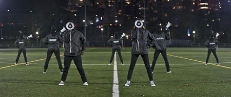 As part of the Bright Lights Public Art Series in East Vancouver during the 2010 Olympic Games, Andy Livingstone Field featured Brawl, a staged evening performance dramatically lit by field lights normally used for sporting events. Tying in ideas of sport and spectacle at the crossroads of two contrasting areas of the city, Brawl highlighted the fine line between violence and theatre. Extending the collective's interest in exploring group identity, public space and collective behaviour, the megaphone-powered scripted performance included actions and texts borrowed from various films and historic Vancouver riots. Soccer-style scarves with texts from the performance ("We're number two/Who the fuck are you?" and "Who's on first?/Yes.") were given away to spectators.