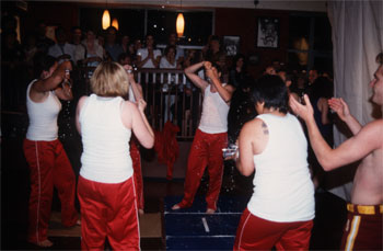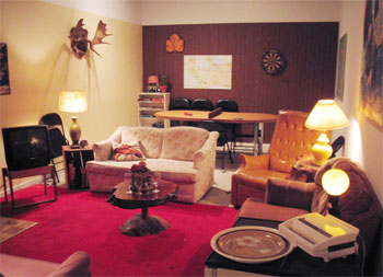 Access Artist Run Centre became, for the duration of the exhibition, a clubhouse. Part installation, part performance document, this multi-faceted project brought together the artists' interest in unscripted, social interactions with the structured context of a gallery exhibition. For five weeks Norma used the gallery as a "home base" for their performances and collective activities. Games (ping pong, Scrabble, etc.), group portraits, uniforms, memorabilia, and a variety of other accoutrements associated with clubs and social organizations comprised the installation. Members of Norma met at Clubhouse on evenings prior to their public performances: group loitering around Vancouver. As a practical, working gathering space, the structure of the clubhouse-installation shifted as the artists tailored it to suit their particular tastes and requirements. Influenced as much by boy bands as contemporary art practices, Norma's Clubhouse circumvents traditional expectations of the gallery space, and paints a sociable portrait of the artist in contemporary culture.