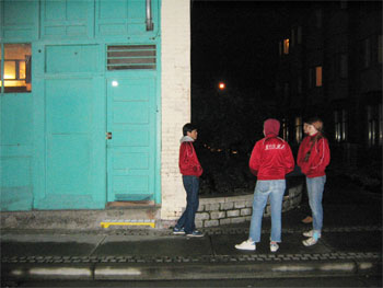 Norma undertook the task of occupying a ghost town in BC, Bradian, for a period of four days in July of 2006. During this time, Norma camped near the bank of a river during the night, and performed a series of tasks to communicate with the town amidst nature's repossession of the decrepit house remains during the light of day. Folky or "primitive" acts of carving, dowsing, drinking rituals, fireside meditation, myth articulation, chanting, berry pilgrimages, and bear hunts were the tools used to commune. The culmination of this project, so far, resulted in two images: one depicting a group of individuals around an urban campfire, and the other a found photo showing five explorers in front of a dilapidated house. Entitled "Ghost Story", this diptych questions the credibilty of the expedition and the accompanying mythology of speaking with nature.