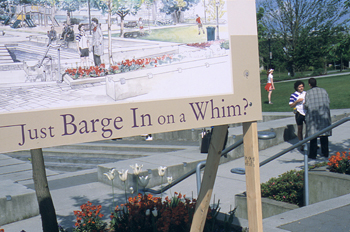 The performers occupied a small public park in a formation similar to the "idealized public" represented in schematic drawings of civic spaces. Participants were assembled in small groups, or alone, and performed repetitive actions and dialogue for a full workday (9:00am - 5:00pm). The script was taken from the 1975 film, Dog Day Afternoon . A billboard similar to those that advertise new housing developments was placed in the space, exactly reflecting the scene playing out behind.