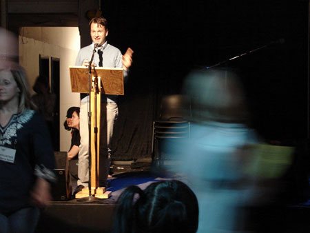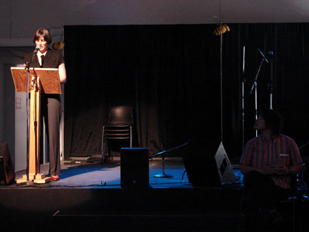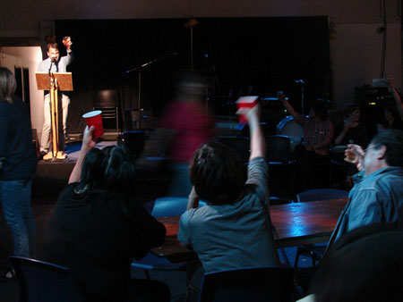 Norma proposed a durational, looping performance for the Hive2 event. The performance, lasting 3 hours, consisted of six members acting out an introductory speech over and over again. One at a time, Norma members took to a podium to recite a speech thanking the organizers of the event, delivering an inspirational quote, and lastly toasting to the evening with a drink before introucing, "without further adieu", the next speaker, ad infinitum. Each performer rehearsed gestures and performed the exact same text (with the exception of a unique inspirational quote for each turn), which subsequently became more and more dynamic as the group came under the influence of repeated toasting. The effect of the work intended to be both irritating and humourous; as patrons came in and out of shows, they would be stuck in a perpetually looping, skipping record-like introductory moment, which added to the "many shows under one roof" HIVE experience.
